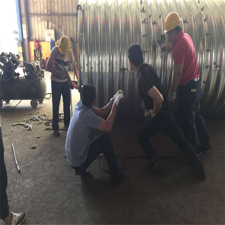 (2) 连接安装波纹管,根据涵洞实际情况,排放涵管。如果涵洞两侧进出水口是与路基同坡度的斜口形式,安装时先安装中间管节,在基础长度方向留出进出水口的位置。中间管节全部安装完毕,校正就位后再安装两侧进出水口。安装时从一侧排放根管节,使其管子中心和基础纵向中心线平行,同样把二根管放置就位,当两根管相邻法兰间相距3~5cm的缝隙时,用小撬棍对准法兰上的螺栓孔,使其两根管法兰上的螺栓孔对正,这时从二节管的另一端用撬杠撬动管节,使其纵向平移,使两法兰间距在2cm 左右,然后全部穿上螺栓,拧上螺丝,带平扣即可。此后依此方式逐节依次连接,每道涵洞中间管节无先后次序,可以随意连接。